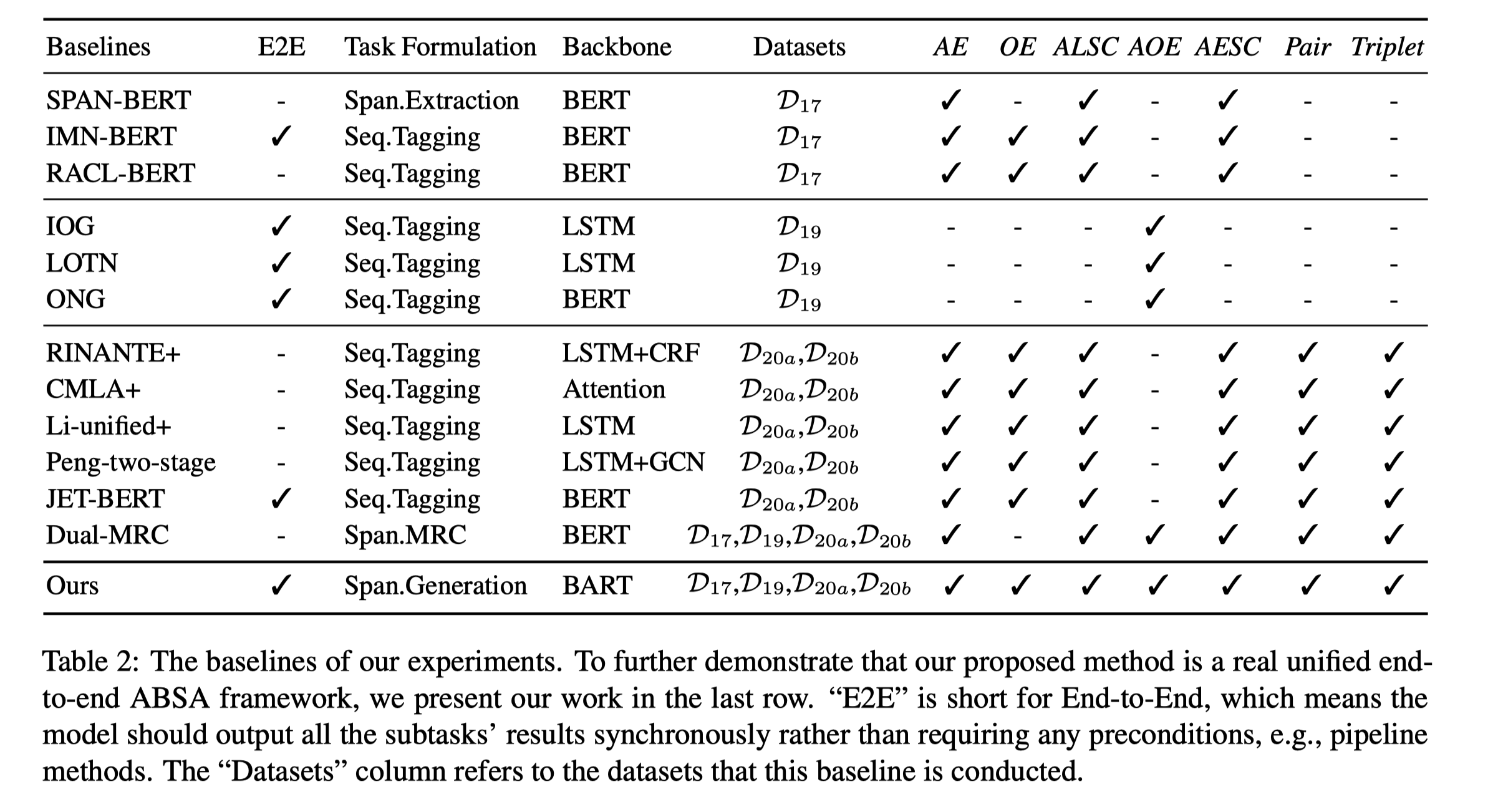 - 论证: 将两类任务定义在统一的 vocab 中, 然后用生成模型来完成比较有新意; 因为生成结果的多样性可以解决 ABSA的不同子任务 (包括给定aspect预测opinion等).