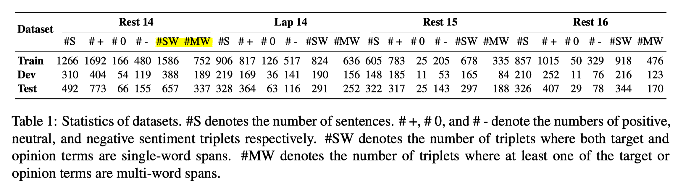 - data: https://github.com/xuuuluuu/SemEval-Triplet-data 包括 SemEval 14 Laptop 和 14,15,16 Restaurant