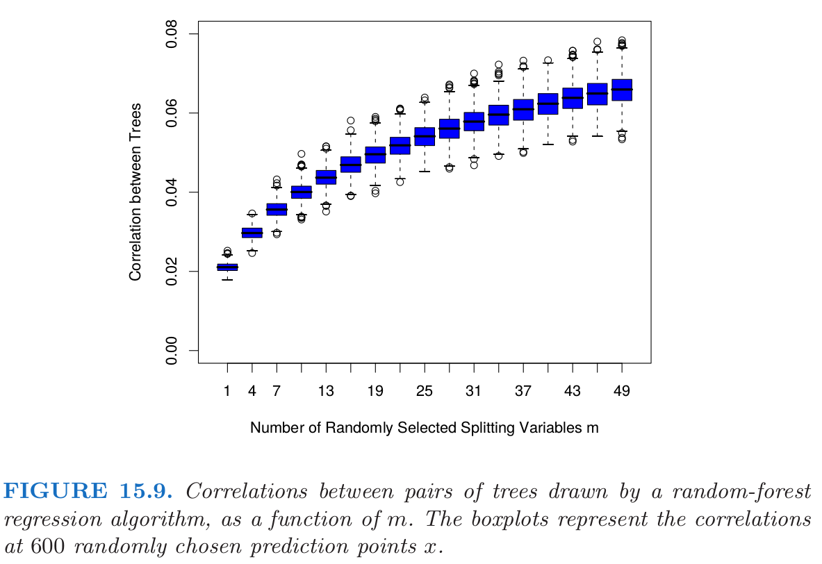 单棵树的方差在 m 的大部分取值范围内不会有明显的改变, 因此根据式 (15.5), 总体的随机森林集的方差显著比树的方差要低.