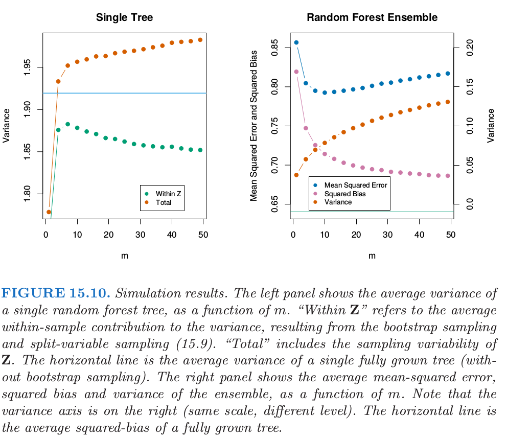 第二项是 \mathbf{Z} 间方差一一随机化的结果, 会随着 m 降低而增大. 第一项实际上是随机森林集(显示在图的右边) 中的采样方差, 会随着 m 降低而降低.