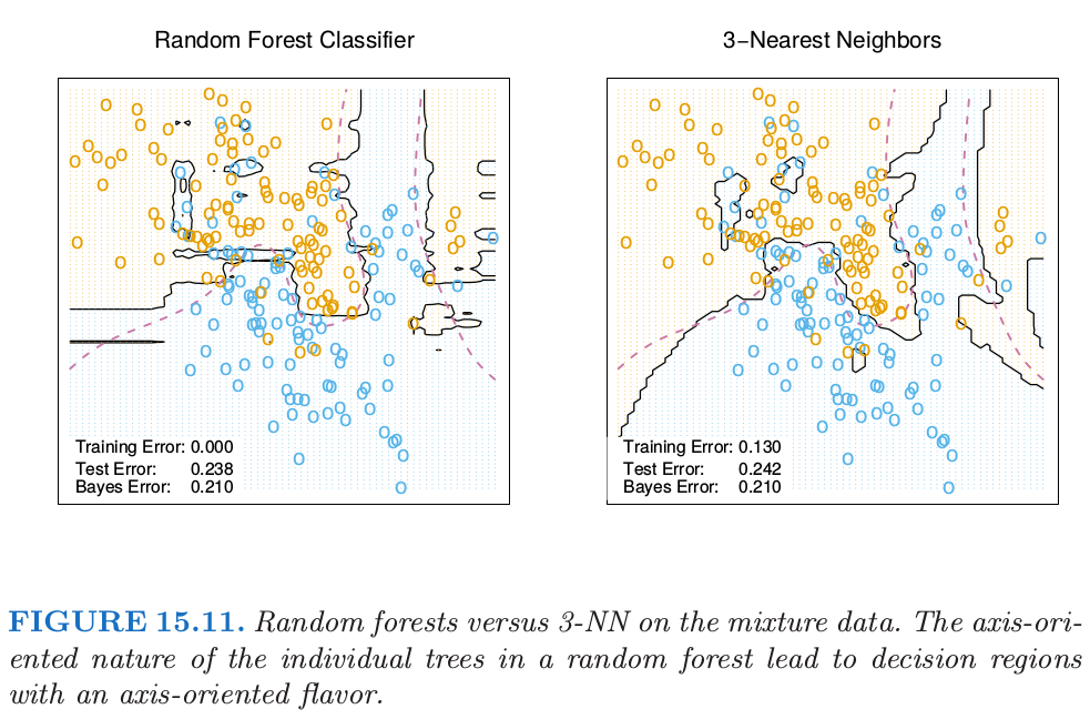 随机森林分类器与 k 最近邻分类器 (13.3 节) 有许多相同的地方; 实际上前者是后者的加权版 本. 因为每棵树生长到最大时, 对于特定的 \Theta^{*}, T\left(x ; \Theta^{*}(\mathbf{Z})\right) 是其中一个训练样本的响应变量的 值. 生成树算法任意从中选择最有信息量的预测量, 寻找到该观测的最优路径. 平均的过程是对训 练响应变量赋予权重, 这最终对预测值进行投票. 因此通过随机森林的投票机制, 那些靠近目标点 的观测赋予了权重一一一个等价核一一这些结合在一起形成了分类边界.