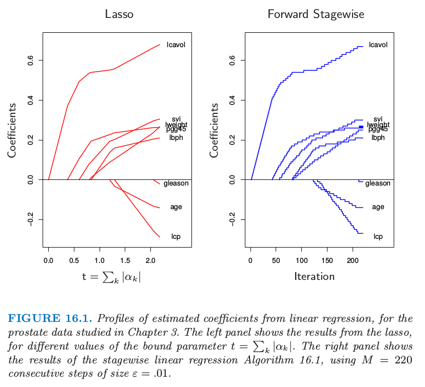 可以看到 Forward Stagewise Linear Regression 和 lasso 的结果非常相似.