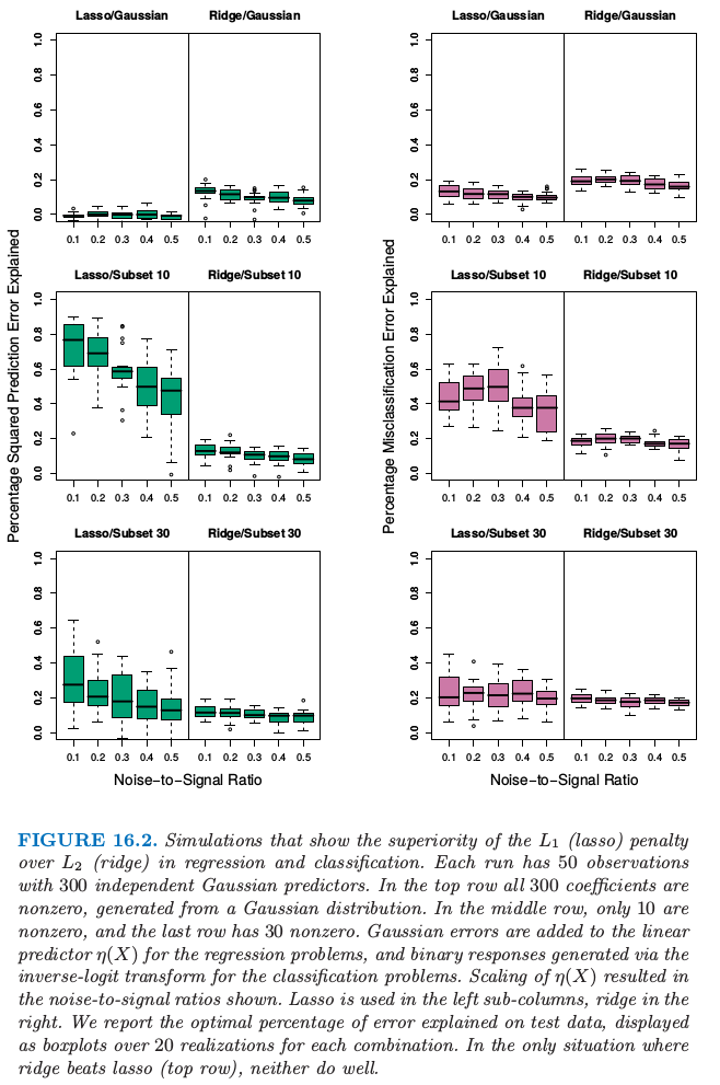 - Notion of sparse vs dense is relative to size of training data and noise-to-signal ratio. 越大的训练集允许我们估计更小标准差的系数.同样地,在小 NSR 的情形中,当给定样本大小我们能识别出相对于大 NSR 情形下更多的非零系数.