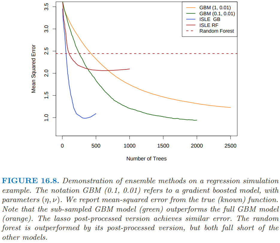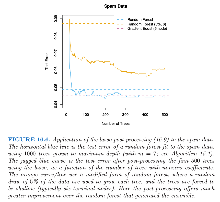 在这种简单的形式里面, 将 \mathcal{T}_{L} 看成是由 gradient boosting 算法或者随机森林算法得到的树的集 合, 该模型可以看成是 boosting 或者是随机森林的某种 post-processing 方式. 通过对这些树进行 lasso 路径拟合, 一般我们会得到更加简化的集合, 它会大大减少末来预测的计算量和存储量. 在 下一节, 我们将讨论这种方法的变种, 进而降低 \mathcal{T}_{L} 的相关性, 并且提高 lasso post processor 的表 现.