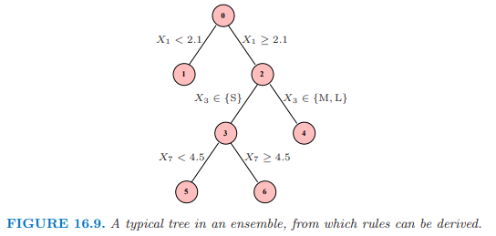 关于规则 1,4,5 和 6 的线性回归等价于树本身(练习 16.3 );因此 (16.14) 是这棵树 过充分 (over-complete) 的基. 对于一个 ensemble \mathcal{T}, 我们可以构造规则的 mini-ensemble \mathcal{T}_{R U L E}^{m}, 并且然后结合形成更大的 ensemble